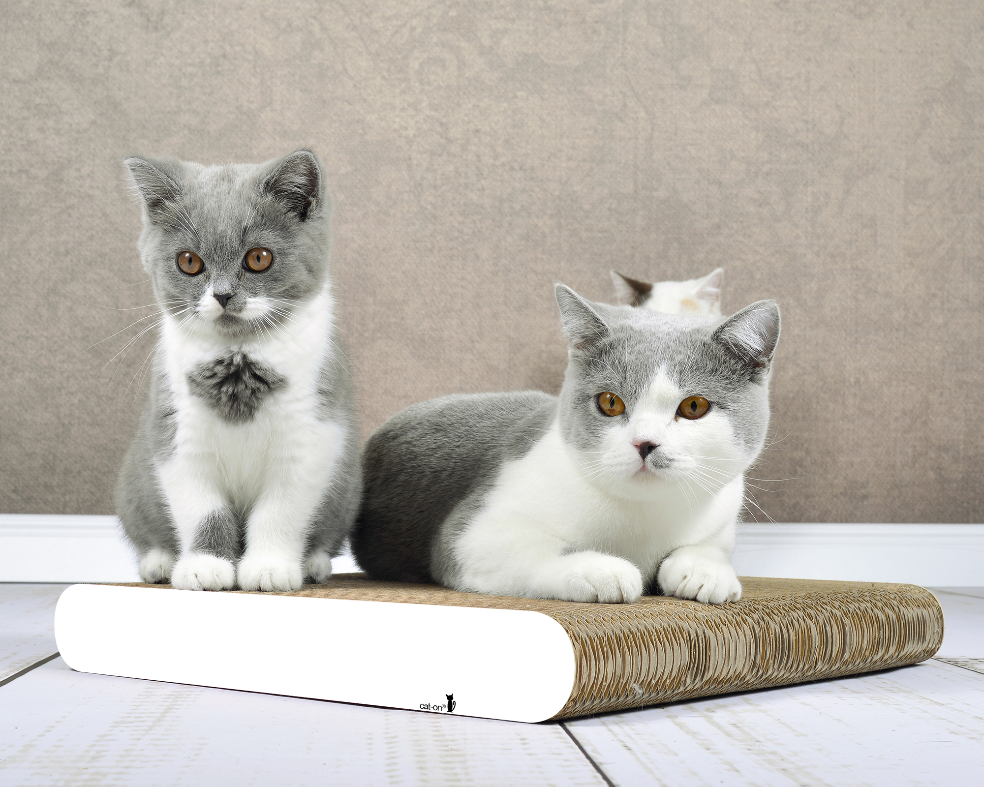 Umweltfreundliche, plastikfreie und individuell konfigurierbare Kratzbretter, auf die sich meine beiden Kater stürzen, sowie ich sie auspacke.