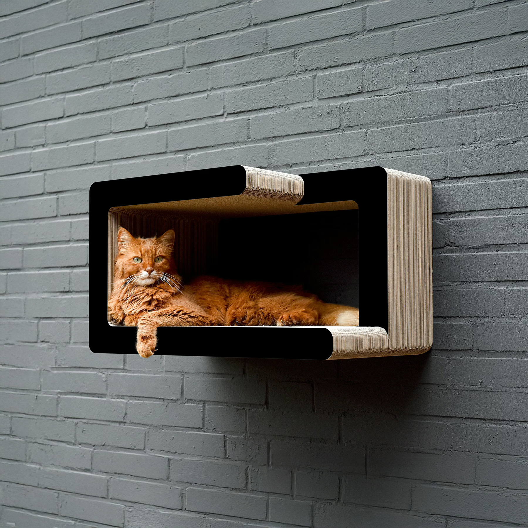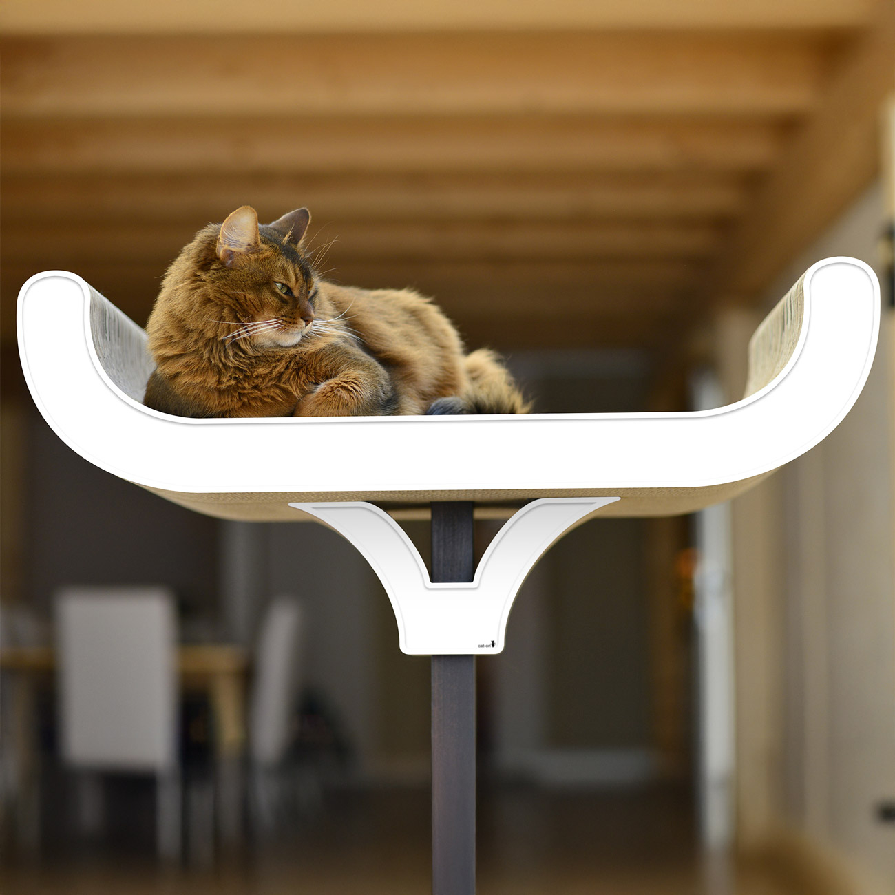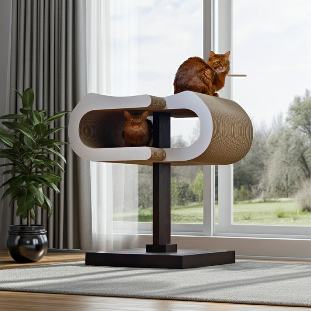 Our modern cat trees function as a cardboard scratcher, a comfortable resting place, and a play surface at the same time.