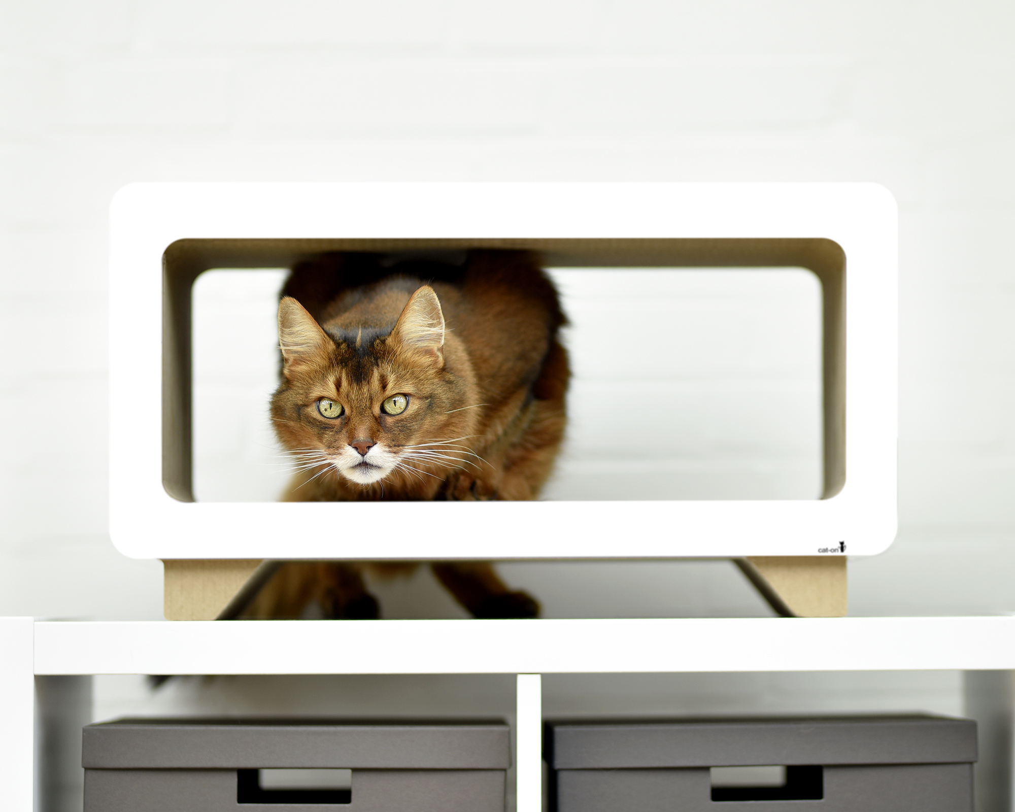 Thanks to its tunnel-like interior, cats instinctively retreat into LA TÉLÉ, curl up, relax, or observe their surroundings from a safe vantage point. The large arch and ergonomic proportions offer a comforting sense of enclosure while remaining open and accessible from both sides.