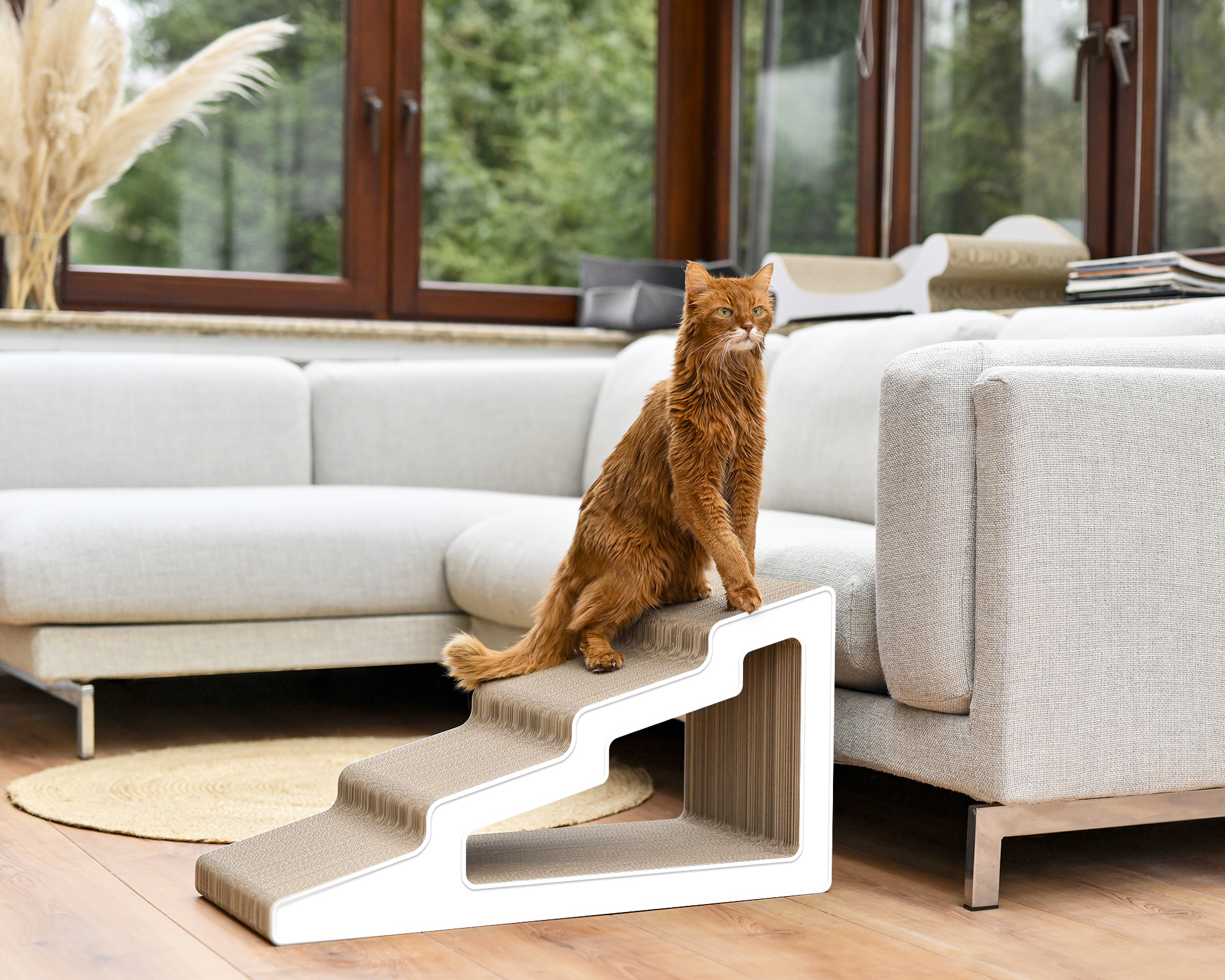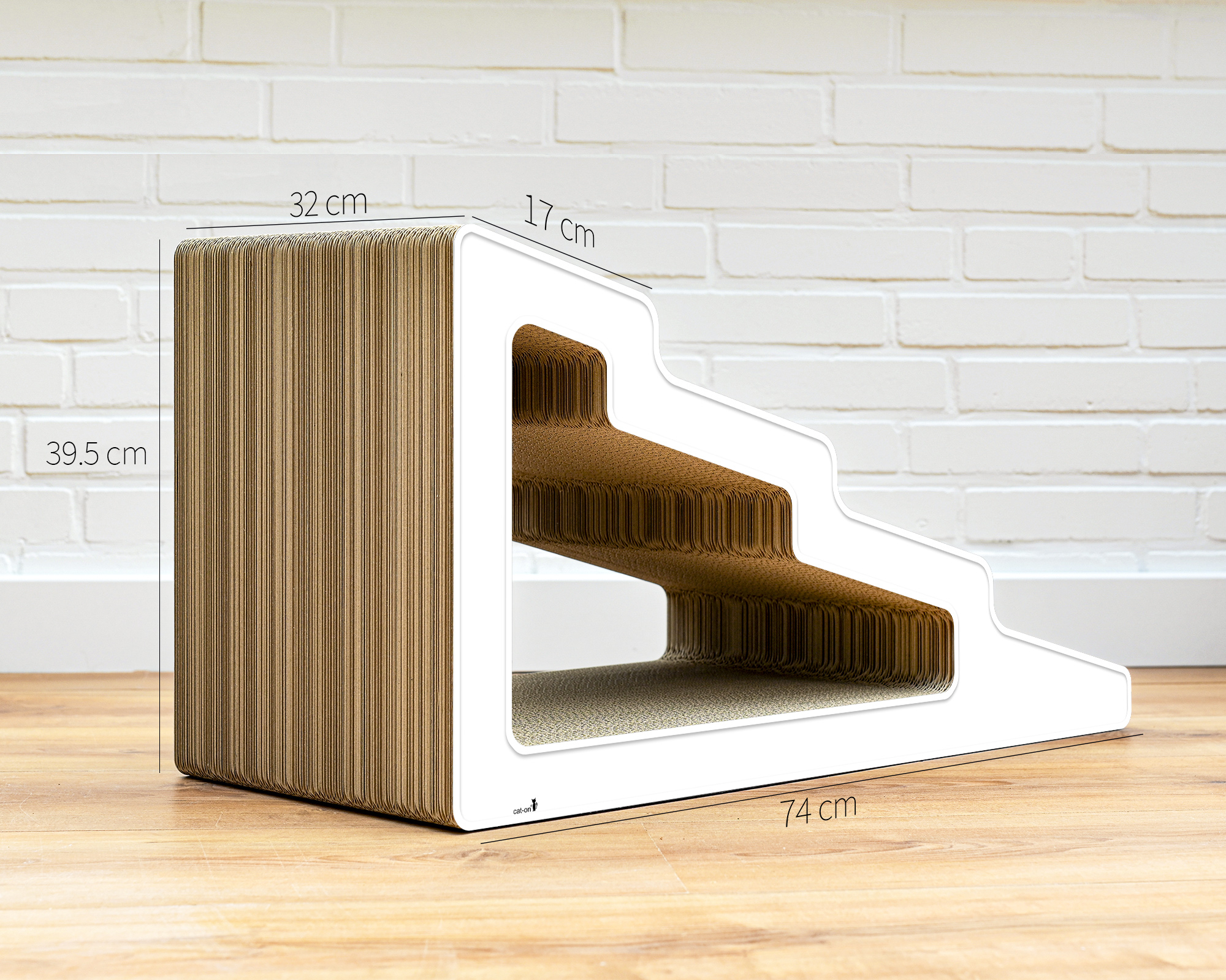 Jede Stufe ist 17 cm tief, sodass Katzen einen stabilen und komfortablen Halt für einen bequemen Aufstieg haben. Die speziell strukturierte Oberfläche aus hochwertiger Wellpappe gibt den Pfoten zusätzlichen Grip, sodass ein Wegrutschen verhindert wird. Besonders Katzen mit motorischen Einschränkungen profitieren von der stabilen Konstruktion, die ihnen Sicherheit bei jedem Schritt gibt.