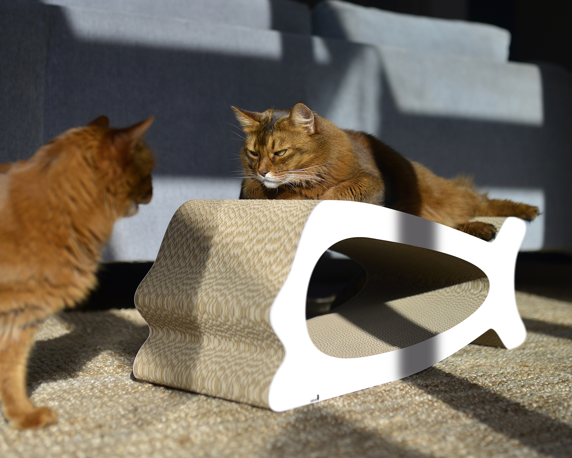 Der außergewöhnliche Wal lädt Katzen zum Krallenwetzen, Spielen und Entspannen ein. Die geschwungene Form bietet gleich zwei Nutzflächen, denn LA BALEINE ist beidseitig verwendbar – oben auf dem Rücken oder unten auf dem Bauch. Diese doppelte Nutzbarkeit macht das Möbel besonders langlebig und stabil. Gleichzeitig dient die große Öffnung im Inneren als gemütlicher Katzentunnel, in dem sich Katzen verstecken, schlafen oder zu zweit spielen können. Mit einer Höhe von rund 26 Zentimetern bietet der Wal genügend Raum für kleine und große Stubentiger und verwandelt sich im Handumdrehen vom Designobjekt zum Wohlfühlplatz.